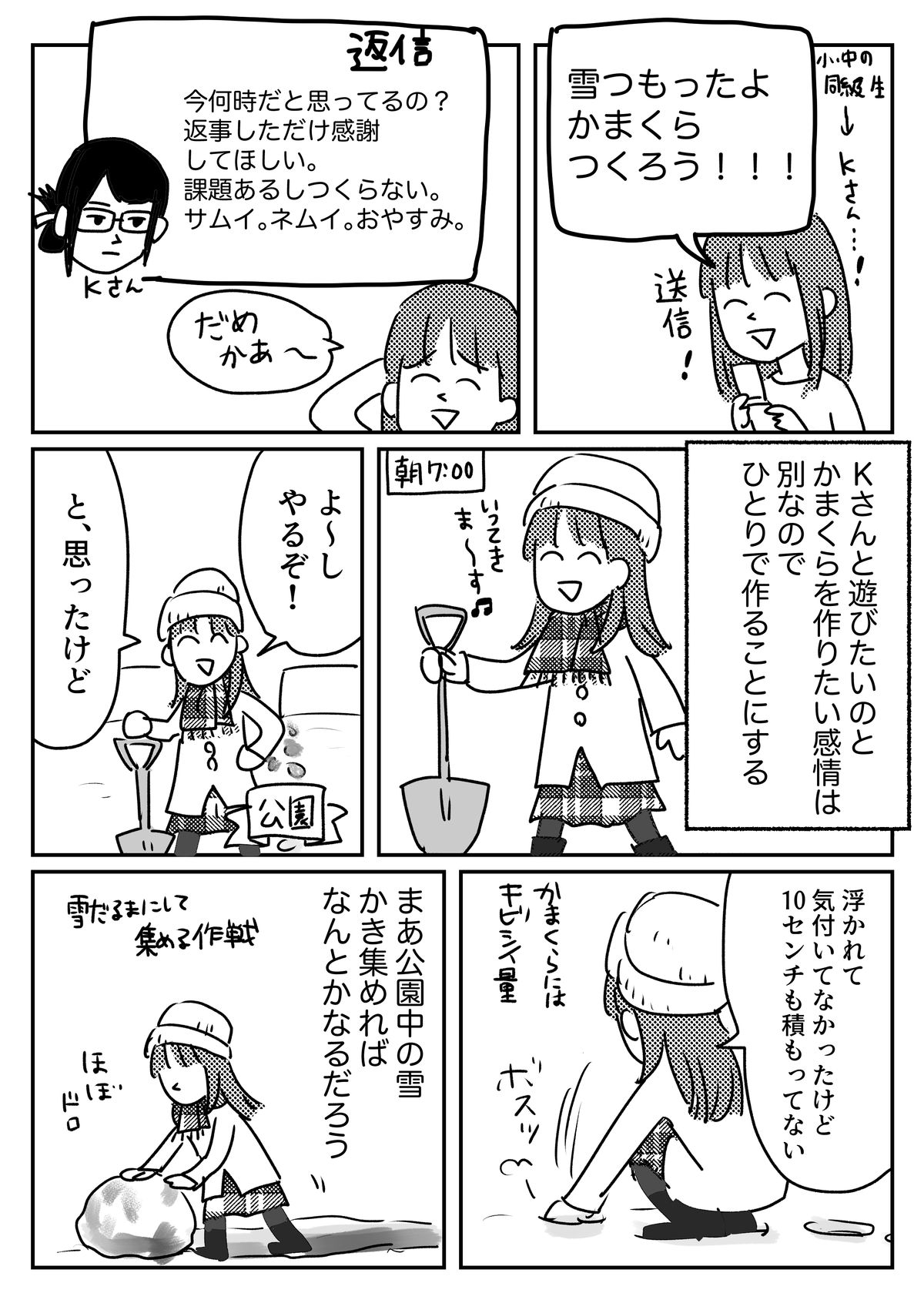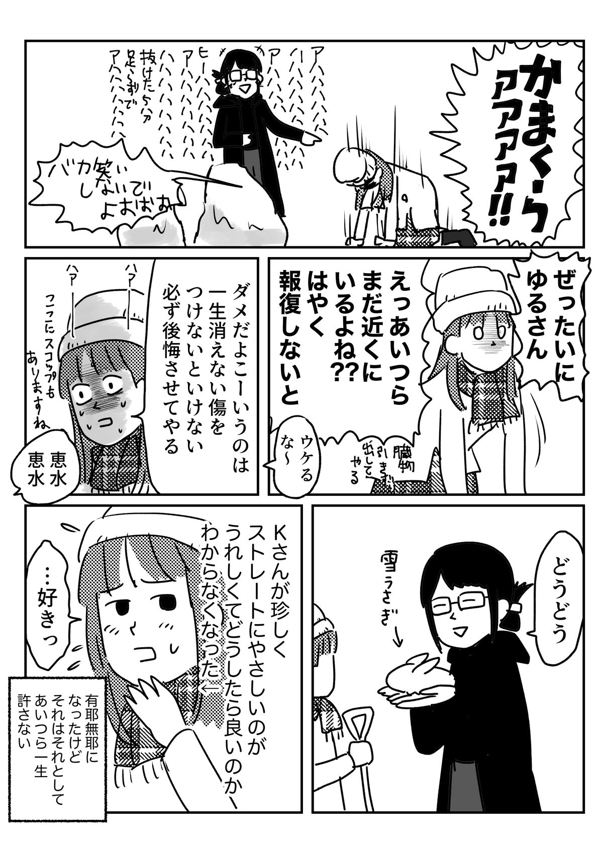 かまくらをひとりで作った話 2019年09月23日 なんで今雪の話なのかというと別に理由はないです寒くなってきたからじゃないですか 友人の顔に免じて今日は見逃してやろう、となっただけで、 雪が降るたびハラワタ煮え繰り返りそうになるくらい今も全く許していません、 絶対に許さない。 追いかけて顔と名前控えるくらいはしておけばよかったかなと思っています。 ごめんちゃいしてもらってないし。 ↓読者登録すると、LINE通知で更新情報が届きます↓応援クリック嬉しいです!おもしろ日記ランキングにほんブログ村 「ひとり遊び」カテゴリの最新記事 タグ :#雪#Kさん#ひとりあそび