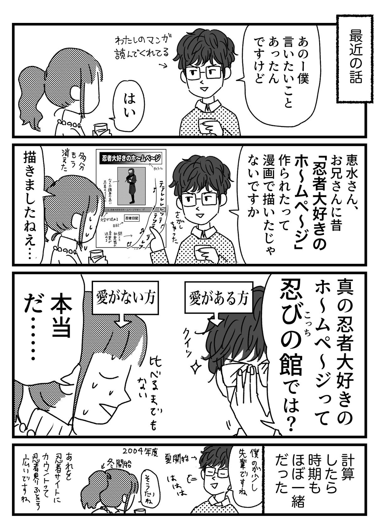 真の忍者大好きのホ〜ムペ〜ジの男の話② 2020年01月17日 私の方の忍者大好きのホ〜ムペ〜ジの話 前回アンケート回答などありがとうございました!長くなってしまいそうなので、結果やいただいた想像図発表はまた別記事でやります!すっごい楽しかったです!みんなの想像とは重なってたかな?私は全然重ならなかったな!同じ気持ちを思い知ってほしかった企画でしたアンケート結果発表! なんか直之進さんがいる記事↑ ↓読者登録すると、LINE通知で更新情報が届きます↓応援クリック嬉しいです!おもしろ日記ランキングにほんブログ村 「忍者」カテゴリの最新記事 タグ :#千さん#直之進さん#嵩丸さん < 前の記事次の記事 > コメント コメント一覧 (10) 1. 通りすがりのP 2020年01月17日 21:24 マンソン笑 そう言われると最初からいたような気がしてくるこれがマンソン効果か… 0 恵水 がしました 4. 恵水 2020年01月18日 18:00 >>1 おれたちいつもの4人がいればへっちゃらだぜ!!!なあ!!!直之進!(初登場) 0 恵水 がしました 2. ななし 2020年01月18日 01:10 直之進さんが書かれた書籍の題名が知りたいです! ちなみに、主人が伊賀者です…。 忍者の末裔かは知らないです😅 0 恵水 がしました 3. 恵水 2020年01月18日 17:57 >>2 経歴に関わってる本載ってたりします! http://ninja-yakata.net/index-naonoshin.html 「幕府御家人 伊賀者の研究」て題名です。伊賀の書店さんに在庫全てあるそうなので、もし購入される際は取り寄せになる、らしいです 末裔として再登場期待してます!w 0 恵水 がしました 6. ななし 2020年01月19日 00:21 >>3 お返事ありがとうございます! へー、伊賀の本屋さんに行ったらあるんですね。 私はそんなに帰ってませんが、主人はほぼ毎週帰ってます(親孝行者)。 また見に行ってみます^_^ ひとまず図書館で借りてみよかな…😅 伊賀は伊賀牛がめっちゃ美味しいです。 松坂牛と系列は一緒みたいですが、伊賀牛は地元で消費されるみたいであまり出回ってないようですが。 0 恵水 がしました 9. 恵水 2020年01月23日 21:53 >>6 伊賀のどこの本屋さんとかは聞いてないのですが、もし本格的にお探しでしたら言ってくだされば答えます〜! 伊賀牛まだ食べたことないんですよね、次行った時ぜったい食べます! 0 恵水 がしました 5. MOMOTARO 2020年01月18日 19:25 KURANDで急に知らない眼鏡の人が出てきてたと思ったら補足読んで納得しました。 児童向け雑誌でしれっと出番放送前に出てくる最後のプリキュアやレンジャーのお助け戦士を彷彿とさせられてなんだか懐かしい気持ちになりましたw 0 恵水 がしました 8. 恵水 2020年01月23日 21:49 >>5 あーわかります!説明のない強キャラ! 第一話のカラー集合絵でも割と見かけますよね。まあ私のはミスなんですけど 0 恵水 がしました 7. 通りすがりのボーガー 2020年01月21日 18:12 いつものリズムだ!リズムを忘れるな!! 0 恵水 がしました 10. 恵水 2020年01月23日 22:03 >>7 ボーガーも通りすがるブログ 0 恵水 がしました コメントフォーム 名前 コメント 記事の評価 リセット リセット 顔 星 情報を記憶 コメントを投稿する