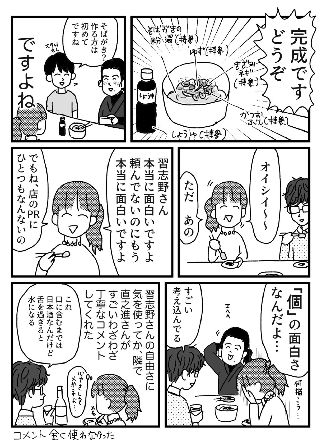 PR漫画に描けなかった飲み会の話 2020年01月29日 これはPRじゃないです PRの方あんなん入れられないけど面白かったので別で描きました。真っ当でいれば拍手喝采になる場所、忍者。グラスがこんなにあるのにマイ枡と盛り塩唐突に出てくるそばがき水筒でお湯持参仕込みナイフで柚子を切る楽しかったですみなさんも是非どうぞすごい店だった 習志野さん嵩丸さん 直之進さん↓読者登録すると、LINE通知で更新情報が届きます↓応援クリック嬉しいです!にほんブログ村 「忍者」カテゴリの最新記事 タグ :#忍者#習志野さん#嵩丸さん#直之進さん < 前の記事次の記事 > コメント コメント一覧 (1) 1. り 2022年01月11日 09:40 さらっと書かれてるけど何気に日本酒の会にカステラ持ってくるのも結構個性的な気が…笑 普通の飲み会なら多分カステラが突っ込まれるところを全部持っていく忍者強い 0 恵水 がしました コメントフォーム 名前 コメント 記事の評価 リセット リセット 顔 星 情報を記憶 コメントを投稿する