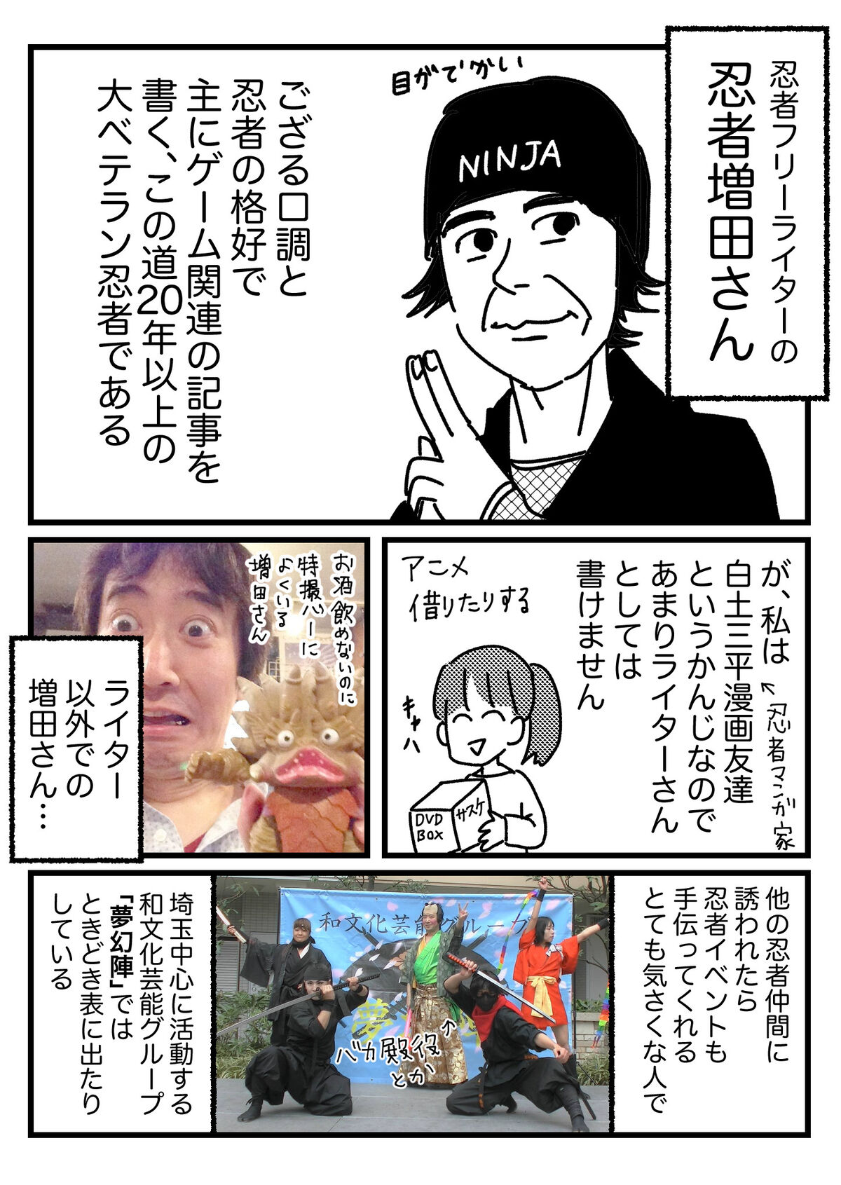 ヒロイン!?忍者フリーライター忍者増田さんの話 2020年05月05日 忍者増田さんtwitter wikipediaもあるよ 柳水(りゅうすい)さんが代表を務める和文化芸能グループ夢幻陣 嵩丸さんがラジオで忍者増田さんの事を語っている回 嵩丸さんがNinTubeで忍者増田さんをいじっている回特撮バーではしゃぐ忍者増田さん忍者増田さんの著書 ↓読者登録すると、LINE通知で更新情報が届きます↓応援クリック嬉しいです!おもしろ日記ランキングにほんブログ村 「忍者」カテゴリの最新記事 タグ :#忍者#現代忍者#嵩丸さん#忍者増田さん#柳水さん < 前の記事次の記事 > コメント コメント一覧 (2) 1. からすまる 2020年05月05日 11:24 忍者好きだけど、芸能グループとかYouTubeとか実際それの活動してる人は知らんもんな~ このブログは勉強になるなぁ。 「ニンスポ」っておもちゃ?のCMを最近見るんすけど、恵水さんとこにPR記事の仕事きたらおもしれーよな~ 0 恵水 がしました 2. 恵水 2020年05月05日 11:28 >>1 ニンスポのトランポリンや手裏剣のやつ、このブログで登場してる習志野さんや相模さん他知ってる忍者公式動画に出てますよ…笑 狭い世界 0 恵水 がしました コメントフォーム 名前 コメント 記事の評価 リセット リセット 顔 星 情報を記憶 コメントを投稿する