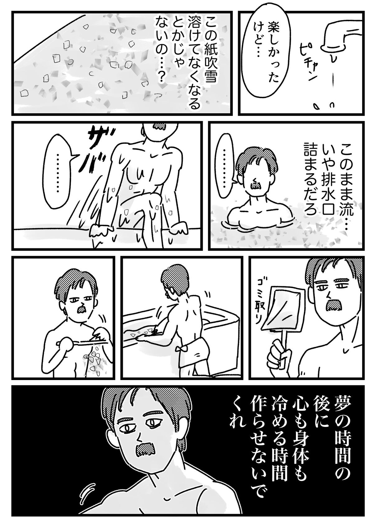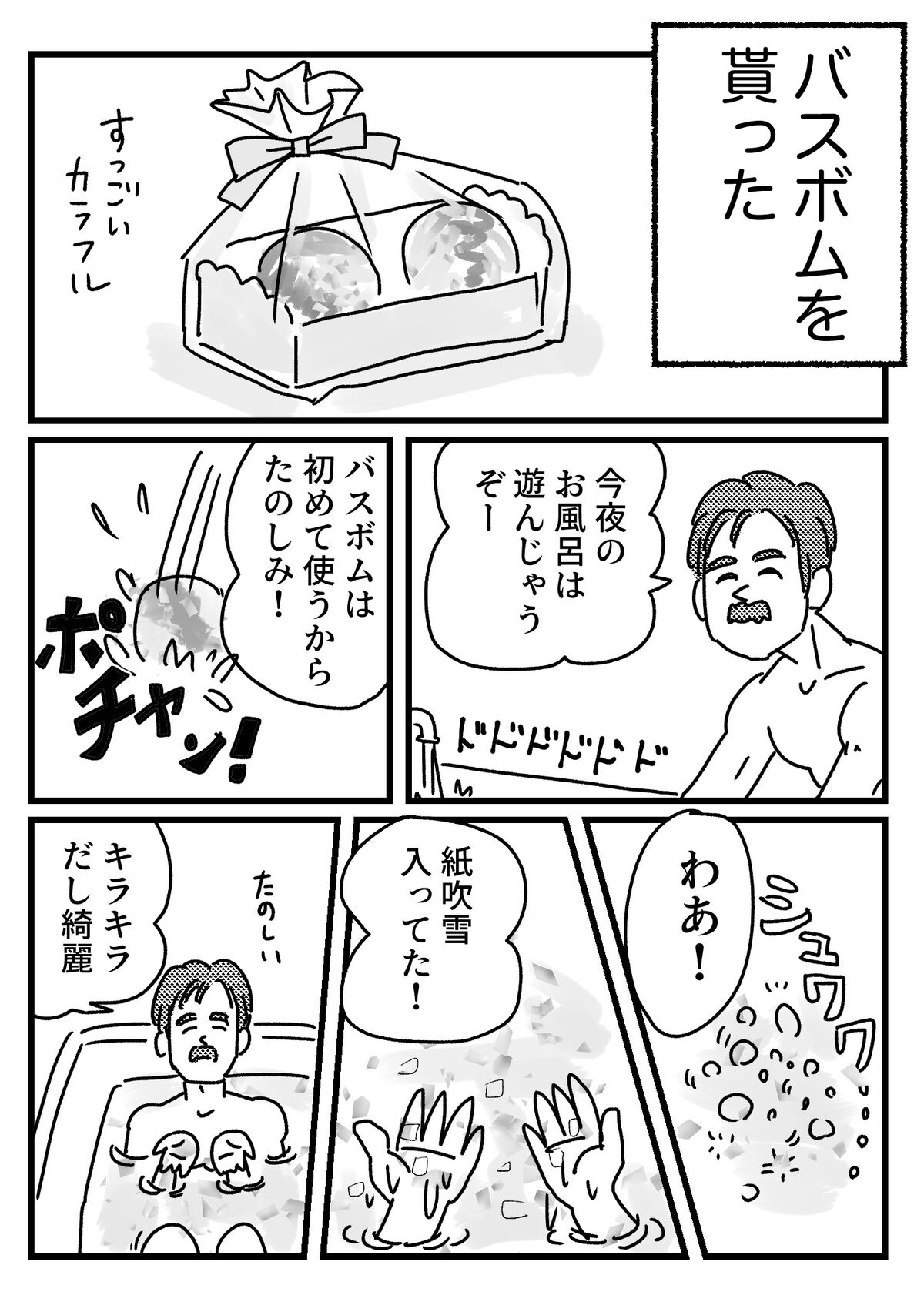 夢の時間は最後にして欲しい話 2020年05月28日 楽しい気持ちで終わりたかったバブで良いですバブで バブは消えて無くなって終わりだし最高紙吹雪GOした奴誰?想像力持って手作りバスボムも楽しそうだな〜と思いましたやんないけどあ、今回なんの説明も書きませんでしたが、風呂回なので恵水さんはおじさんになりました。 ↓読者登録すると、LINE通知で更新情報が届きます↓応援クリック嬉しいです!おもしろ日記ランキングにほんブログ村 「ひとり遊び」カテゴリの最新記事 タグ :#ひとりあそび < 前の記事次の記事 > コメント コメント一覧 (21) 1. お沼 2020年05月28日 06:43 追い焚きOKで楽しめるアンパンマンの泡入浴剤あるんですが、結構泡立つので良い大人もヒャッフー!となります。 0 恵水 がしました 11. 恵水 2020年06月14日 04:56 >>1 泡のみならイイデスネ!!! 0 恵水 がしました 2. 名無し太郎 2020年05月28日 11:57 こういうタイプのバスボムは、最初に三角コーナーのゴミ捨てるネットにバスボムを入れてからドボンと風呂に入れる方もいらっしゃるそうです。最初から紙は散らなくなるので若干おもしろくはなくなりますが、バブとはまた違った香りや色のバスボムを面倒臭くなく楽しめると思います。あと手間はかなり省けますね。もし恵水さんが次回紙吹雪入りバスボムを利用することがあればぜひお試しください〜。 0 恵水 がしました 12. 恵水 2020年06月14日 04:56 >>2 次もし貰っちゃったらそういう使い方にします!!ありがとうございます! 0 恵水 がしました 3. torima 2020年05月29日 05:36 自分だったら排水口詰まるとか考えもせずにそのまま流してしまいそう… 危険を教えてくれてありがとうございます!(いや想像力大事ですね!) 0 恵水 がしました 13. 恵水 2020年06月14日 04:57 >>3 溶けるかな〜と思ってかなり待ったんですけど全然溶けなかったんで頑張って片付けました(白目) 0 恵水 がしました 4. 通ボ 2020年05月29日 08:57 恵水さんのイメージが段々「お風呂に入る時おじさんになる体質の人」になってゆく… 0 恵水 がしました 14. 恵水 2020年06月14日 04:57 >>4 らんまと一緒ですね(?) 0 恵水 がしました 5. ななお 2020年05月29日 16:08 ファンです 風呂回なのでおじさんになりましたという一言で済ませサウナ回へのリンクは貼らない無欲さにますます好きになりました あっリンクは貼ってあっても好きです! 0 恵水 がしました 15. 恵水 2020年06月14日 04:58 >>5 あー貼った方がわかりやすかったですね、なんかまあ説明足りなくてもいいかなって 0 恵水 がしました 6. そら 2020年05月29日 19:46 この手のバスボムは某ショップに多いですが、私は小さめの洗濯ネットに入れてからの方がお掃除ラクですよ〜とお店のお姉さんが教えてくれました。 そうすると、バラの花びらとか、紙吹雪が散らないのでちょっともったいない気分ですけど(汗) 0 恵水 がしました 16. 恵水 2020年06月14日 04:59 >>6 両立出来ればいいんですけどね〜30分くらいで溶けて欲しい 0 恵水 がしました 7. ハム子 2020年05月30日 17:36 この記事をみてなんとなく某◯ッシュのHP見たら、ニンジャのバスボムがあって笑いました。 ラメ入りみたいです。 0 恵水 がしました 17. 恵水 2020年06月14日 04:59 >>7 調べたら割とかわいくて、ちょっと欲しくなりました、でも一個約千円… 0 恵水 がしました 8. もきち 2020年05月30日 19:26 元ラッシュ店員です! 最近はこういう掃除しなきゃいけない系てほぼ減ってきたんですけどね… すごく派手ですが基本的には水で溶けるものや自然由来ものばかりで作られていて、ラッシュ自体も海洋プラスチックをすごく問題視してさまざまな活動をしているんで、Twitterでみなさんが『ラッシュか〜可愛いけどね、ゴミ出るのはね〜』と会話されてるのがすこし悲しくなってしまいました… ちなみにジンジャニンジャにはお砂糖でできたお星様のラメが入っていてすごく可愛かったんですよ! また楽しんでつかってもらえますように… 0 恵水 がしました 18. 恵水 2020年06月14日 05:01 >>8 ラッシュアンチするつもりではなかったのですが、悲しい思いをさせてしまってごめんなさい! 洗顔は一時期愛用してましたし好きです ニンジャいつか一回試したいですw 0 恵水 がしました 9. 嫁 2020年05月30日 21:57 うえー手作りバスボム簡単ですよ!是非!多分好きだと思います。クエン酸と重曹。以上。お好きな方は食紅で色つけたらヤダかわいーって感じですよ。いろんな形の製氷皿とかマドレーヌ型で作るんですよしかもバブと同じ効果あります。子供が小さい頃『絶賛お風呂入りたくない期』に一緒に作って子供とボムをぶち込んでました。狂喜乱舞です。 材料一緒なので同時にラムネも作れるのが良いです。 0 恵水 がしました 19. 恵水 2020年06月14日 05:01 >>9 食紅は以上に持ってるので自分で作るのも楽しそうですね〜 0 恵水 がしました 10. ぽむ 2020年05月31日 02:28 俺様ティーチャーに忍者でてきたようですが、面白かったですか? 0 恵水 がしました 20. 恵水 2020年06月14日 05:02 >>10 今100話くらいですが楽