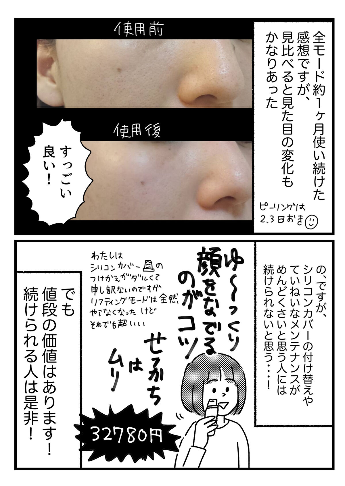 【PR】ウォーターピーリング複合美顔器Rocklean使ってみましたって話 2021年05月08日 購入サイトはこちらから5/10まで最大7500円オフのセールをやっているそうなので、この機会にぜひ! 顔面をガッツリ晒す前にすっぴん肌を晒してしまった…↓読者登録すると、LINE通知で更新情報が届きます↓応援クリック嬉しいです!おもしろ日記ランキングにほんブログ村 「おしごと」カテゴリの最新記事 タグ :#おしごと#PR < 前の記事次の記事 > コメント コメント一覧 (3) 1. おぉ! 2021年05月08日 22:34 こんばんは❗ コレ、気になってたんですよー! スゴく良くなってるじゃないですか✨✨ 毛穴も締まって小さくなってるし、肌艶もよくなってる! シリコンカバーの付け替え、そんなにダルいのですか? イマイチ想像が出来ない(^_^;) 0 恵水 がしました 2. 恵水 2021年05月08日 23:48 >>1 付け替えそのものはパッパと出来ますがその後の洗ったり管理も毎日ってなると、う〜ん行程減らしたい!ってなります 笑 0 恵水 がしました 3. 2021年05月09日 00:41 恵水さんの貴重な入浴シーン 0 恵水 がしました コメントフォーム 名前 コメント 記事の評価 リセット リセット 顔 星 情報を記憶 コメントを投稿する
