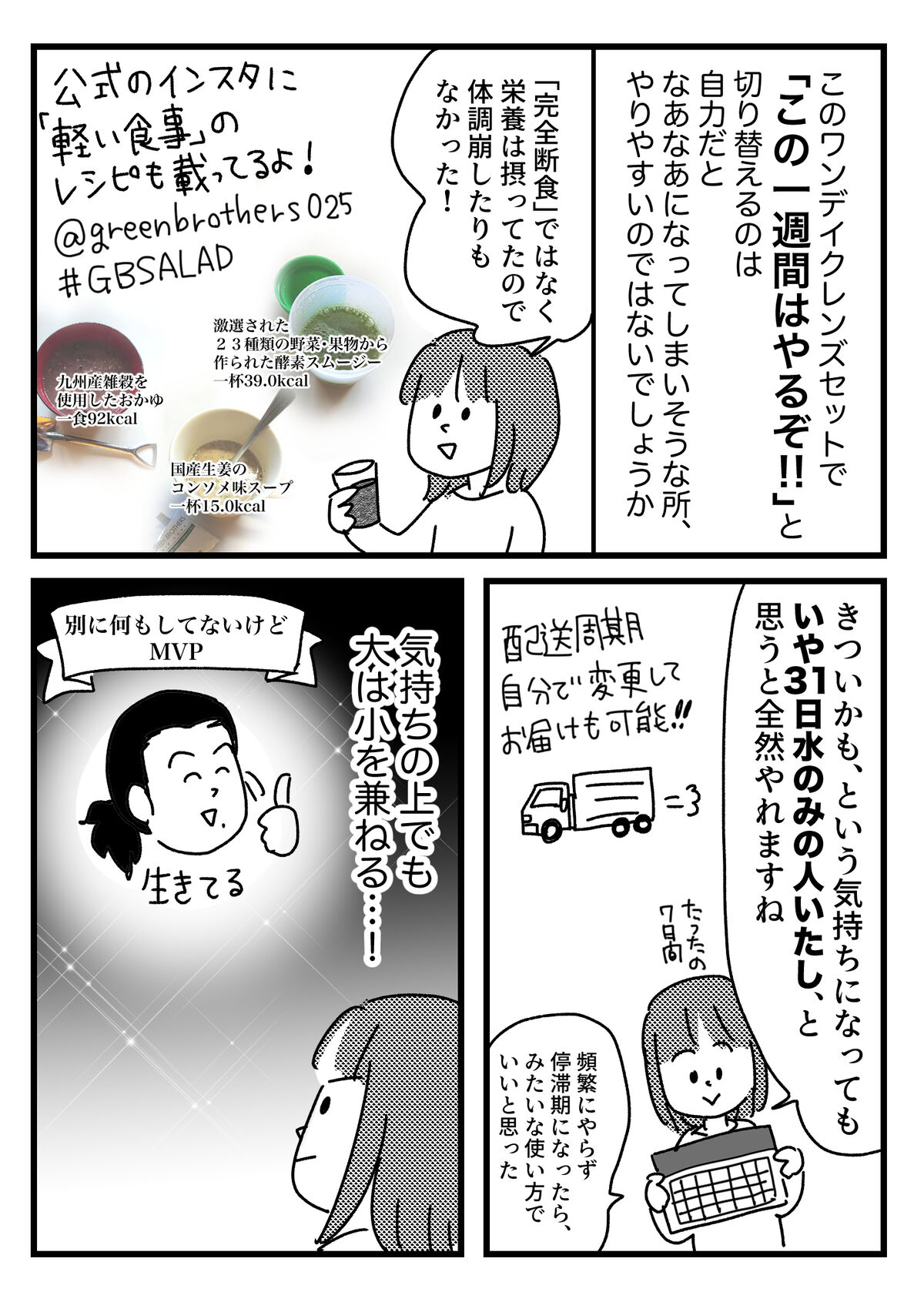 【PR】GB 1DAY CLEANSE SETでプチファスティングしたよって話 2021年10月19日 テコ入れ成功!!!!ばんざ〜い↑購入ページはこちらから通常セット1回目は75%オフの2138円(税込)なので、一回注文して解約しても良いと思います!出てきた人以前31日間完全断食した忍道家の先生別に私の断食中関わってない詳しくはこちらからダイエット1ヶ月の詳細はPRではなく別記事でまとめますちなみに一週間カレンダーには感想書き込めたんですが一日二日目の感想がひどい↓読者登録すると、LINE通知で更新情報が届きます↓応援クリック嬉しいです!おもしろ日記ランキングにほんブログ村 「おしごと」カテゴリの最新記事 タグ :#PR#ダイエット < 前の記事次の記事 > コメント コメント一覧 (1) 1. むぅ 2021年10月20日 22:00 母親に1ヶ月断食した人がいるって言っても信じてもらえない… 0 恵水 がしました コメントフォーム 名前 コメント 記事の評価 リセット リセット 顔 星 情報を記憶 コメントを投稿する