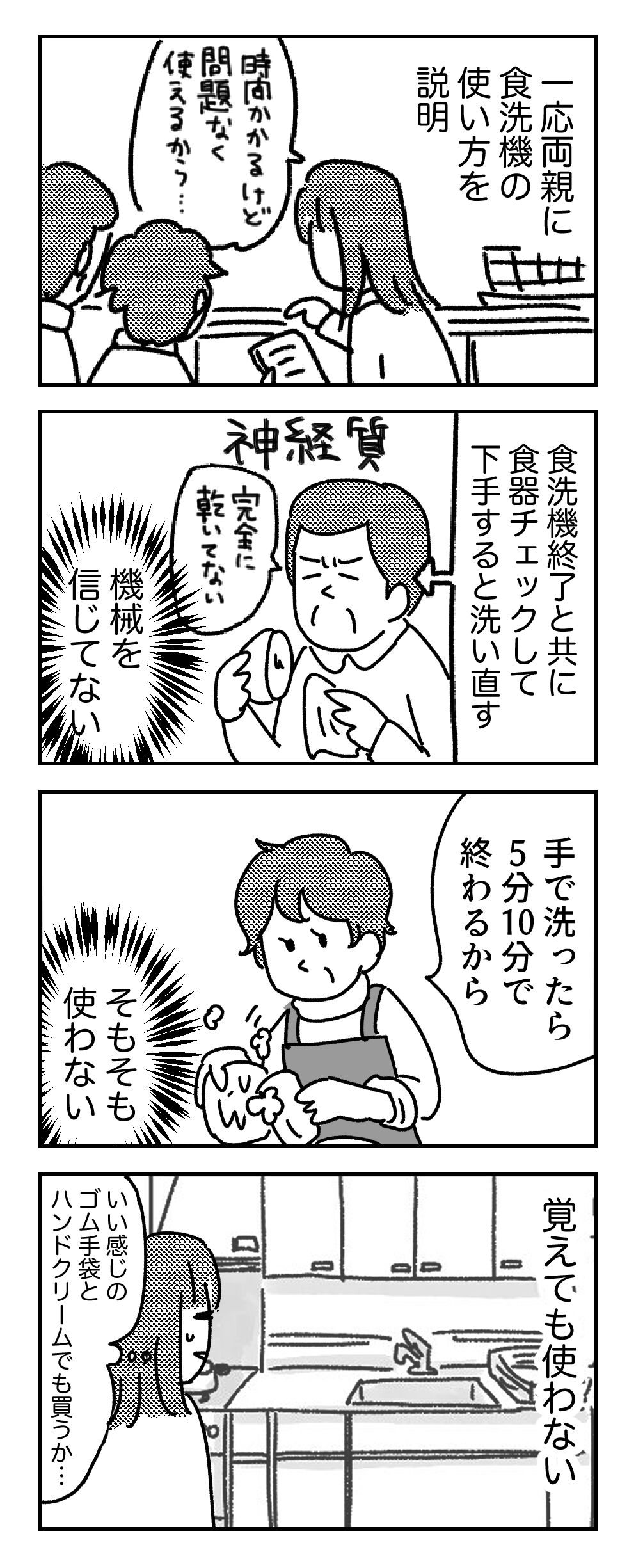 うちの60代の両親も、そもそも食洗機使わない・たまに感想のみ使う時は120%まで食器詰め詰め(グラス割れてます)乾燥だけ使う時も、もう乾いたと8割くらいで止めて残りはフキンで拭く等、謎すぎる使い方します…