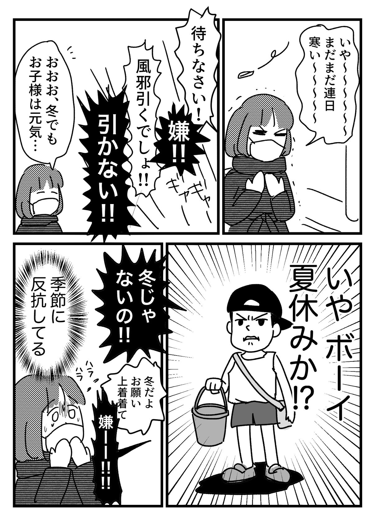 人間以上のものに立ち向かう少年の話 2022年01月20日 親がかわいそうだから立ち向かわないであげて欲しいけど、大物だな…とは思った オリジナル忍者!2/2まで募集してます!↓読者登録すると、LINE通知で更新情報が届きます↓応援クリック嬉しいです!おもしろ日記ランキングにほんブログ村 カテゴリなしの他の記事 < 前の記事次の記事 > コメント コメント一覧 (7) 1. あからさま 2022年01月20日 19:34 自分、半ズボンだった。上はさすがに着てたけど。何で平気だったんだろう? 0 恵水 がしました 2. あ 2022年01月21日 00:34 前に初詣に行ったときですが上着を着てないボーイに遭遇しました。盛大に鼻水出してましたがすごいなと思いました。平熱が高いのか風邪ひいて熱出てたのか分かりませんがお母さんは大変ですよね 0 恵水 がしました 3. しーな 2022年01月21日 01:32 私も高校生の頃、コート着るのダサいと言う謎理論で真冬もコートほとんど着ずに素足に靴下でした。 若いと寒さの耐久性が強いのかバグってるのか…今はもうヒートテックとダウンコートとムートンブーツ命です! 0 恵水 がしました 4. いたいた!! 2022年01月21日 08:35 私の時代にも息子の時代にもいました!年中常夏ボーイ。でも女子では見かけなかったのは何故なんだろう?自分が親になって分かるけど、親御さんは大変だ😅 0 恵水 がしました 5. はな 2022年01月30日 09:10 うちの娘も5年生までずっと雪が降ってもショートパンツに半袖で学校行ってました😅その間全く風邪もひかずでしたが6年生になって長袖にするってなってから 風邪引くようになりましたw 息子も今3年生ですが 半袖半ズボンで学校行ってます😇 幼稚園が半袖半ズボン 裸足教育だったので、その影響なのか🤔 見た目に私が寒いので服着て欲しいですし お友達に長袖買って貰え無いの?ってネグレクト疑惑まで掛けられて 長袖買っても新品のままサイズアウトする母の気持ちは複雑です 0 恵水 がしました 6. むぅ 2022年02月23日 20:12 自分は年取って寒さ平気になったかも (年中半袖。外出するときは長袖とか上着着るが店に入るとアツい) 0 恵水 がしました 7. むぅ 2022年02月23日 20:12 自分は年取って寒さ平気になったかも (年中半袖。外出するときは長袖とか上着着るが店に入るとアツい) 0 恵水 がしました コメントフォーム 名前 コメント 記事の評価 リセット リセット 顔 星 情報を記憶 コメントを投稿する