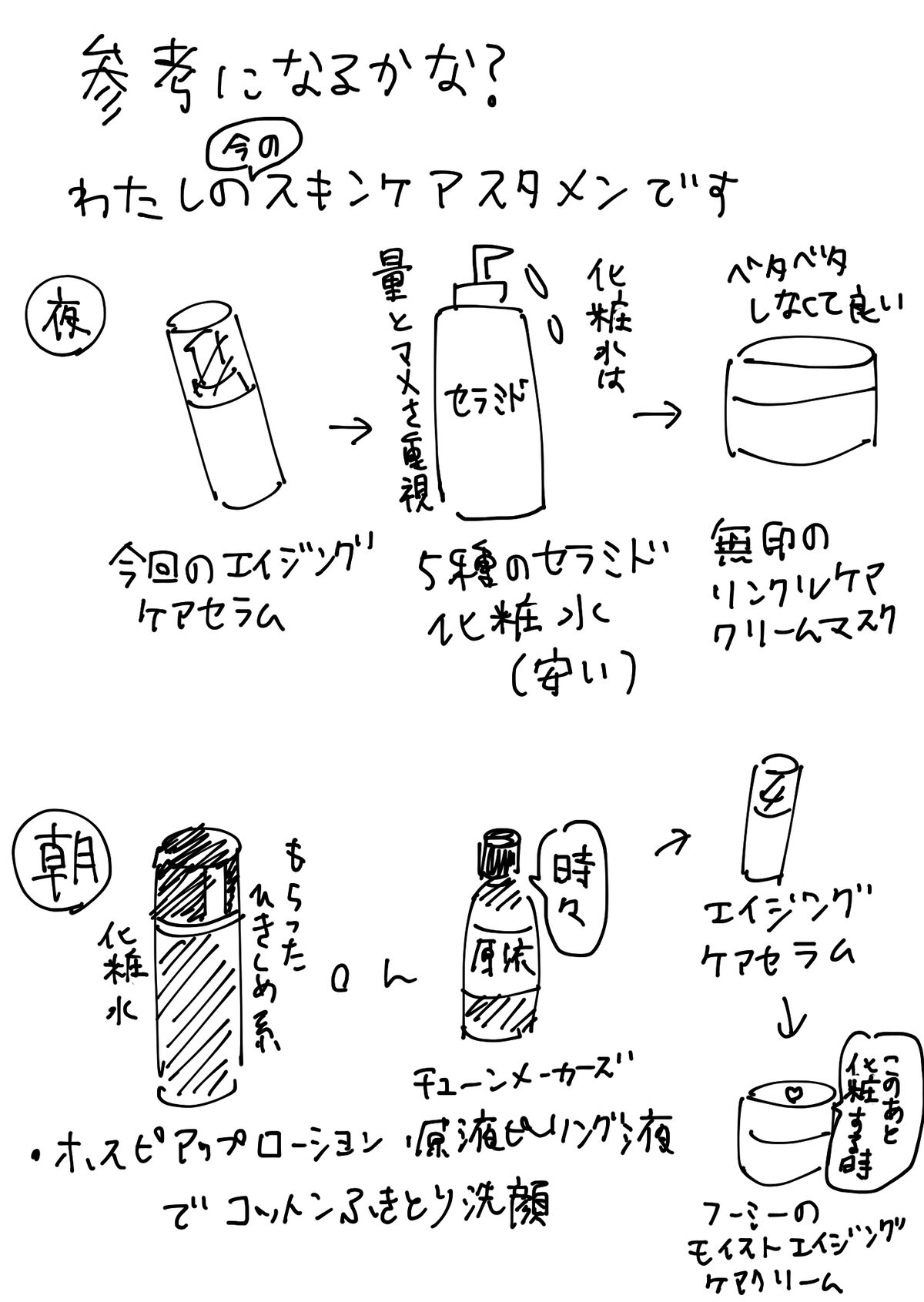 朝と夜の内容が違うのは、夜は保湿重視、朝は目覚めの引き締めからの、化粧する場合クリームは油分多い方が持ちがいいのでフーミー って感じです。化粧しない日は朝も無印ですね。