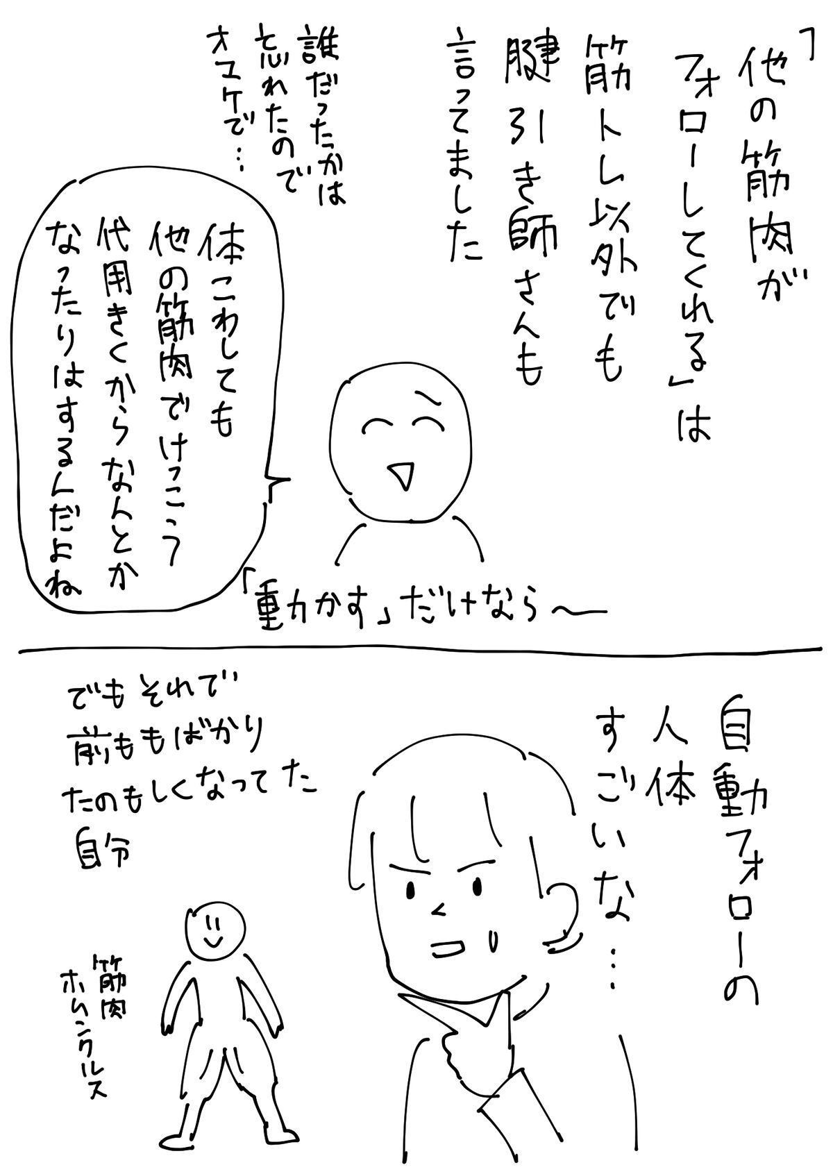 おい!おれの筋肉、おい! 2022年05月21日 オンラインフィットネス日記です。意識するとそれだけで結構ちゃんと使えるそうです。本当に筋肉とコミュニケーション大事(口に出さなくていい)オンラインフィットネス系記事一覧やってます強いやつに頼りっぱなしだったのを今はみんなで出来るようにしたい 前回記事の1件コメント返信かわいい!けど作品が違う!けどどっちも青い猫ですねw↓読者登録すると、LINE通知で更新情報が届きます↓応援クリック嬉しいです!おもしろ日記ランキングにほんブログ村 「ダイエット」カテゴリの最新記事 タグ :#30.f < 前の記事次の記事 > コメント コメント一覧 (1) 1. かむ 2022年05月22日 18:49 今日、田中先生の腱引きを受けました! ブログで拝見していた通り、優しくて丁寧な先生でした。 えげつなく痛い施術で何度も悶絶しましたが、 腰の違和感が一撃でした!! 恵水さんのおかげで腱引きに出会えて良かったです。 本当にありがとうございます🙇 0 恵水 がしました コメントフォーム 名前 コメント 記事の評価 リセット リセット 顔 星 情報を記憶 コメントを投稿する