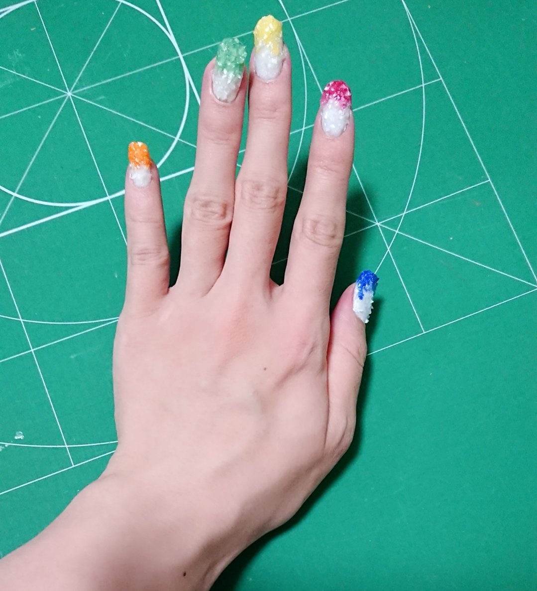 You Tubeで見た塩でやったかき氷ネイルの質感がよかったけど塩は使いたくなくて、ダイソーのレジン用パーツの粒子大きさ違うの2種類混ぜてやってみたら自分的に大成功しました シロップぽさ出したかったので氷部分はあえてマットトップにして質感変えました