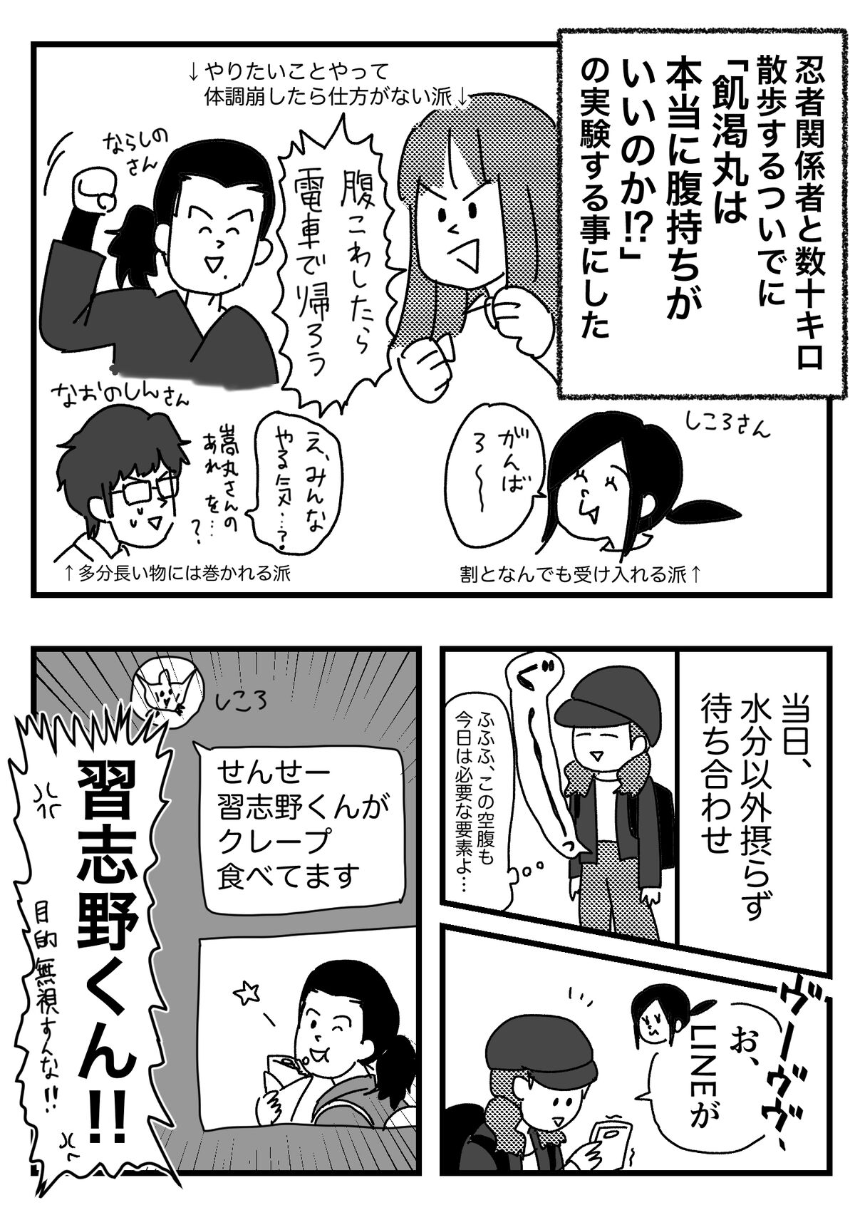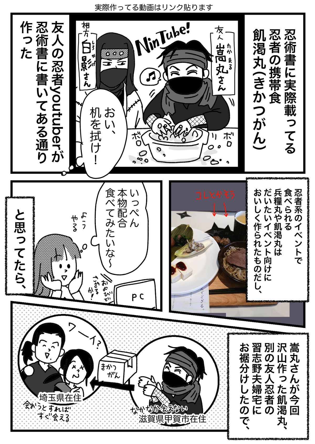 忍術書に書いてある通り?作った飢渇丸食べてみた話① 2022年08月01日 こら!!!!!続きます実際嵩丸さん、白影さんが飢渇丸作ってる動画↑私がイベント等で見てきたのはもうこんなかんじでおいしくアレンジされてました出てきた人はここで紹介してます 半年に一回くらい長距離歩いてるいつメン前回記事の1件コメント返信 聞いたことなかったんですけど悪口過ぎない? そして前回描いたガガンボ話をgrapeさんで記事にしていただきました〜ガガンボが… 次↓読者登録すると、LINE通知で更新情報が届きます↓応援クリック嬉しいです!おもしろ日記ランキングにほんブログ村 「忍者」カテゴリの最新記事 タグ :#習志野さん#しころさん#嵩丸さん#直之進さん#白影さん < 前の記事次の記事 > コメント コメント一覧 (3) 1. Mr.忍(しのび) 2022年08月01日 22:42 習志野さんは自由ですねw 0 恵水 がしました 2. ほるもん 2022年08月02日 03:52 クレープ美味しいもん。仕方ない。 0 恵水 がしました 3. なかば 2022年08月02日 18:26 「おい、机を拭け!」に笑ってしまった 0 恵水 がしました コメントフォーム 名前 コメント 記事の評価 リセット リセット 顔 星 情報を記憶 コメントを投稿する