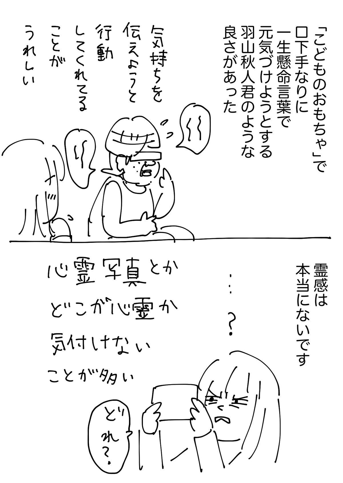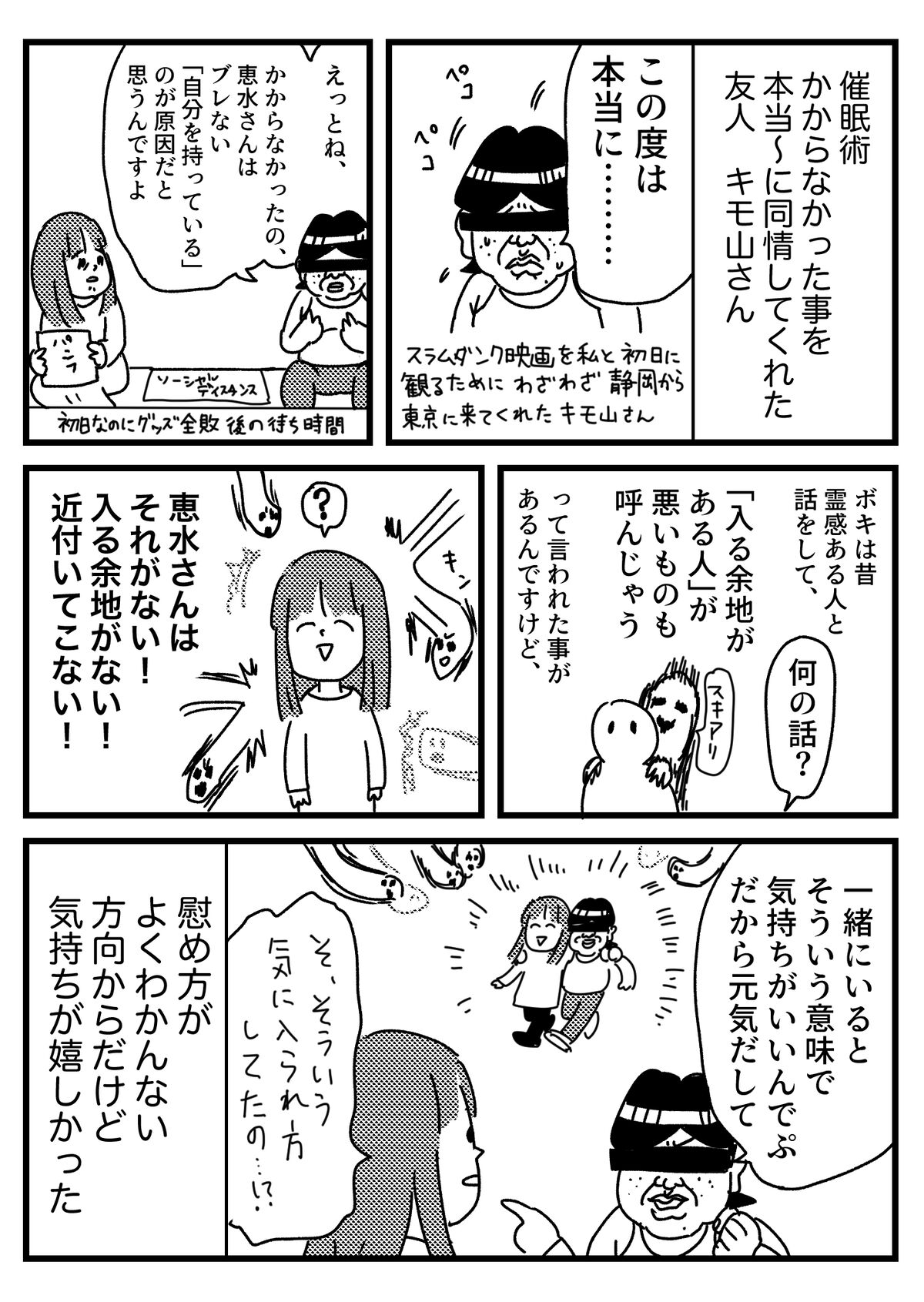 二次元の想い人に催眠術で会いに行った話【その後】 2023年04月25日 その0その1その2その3その4その5その6その7その8その9その10その11その12その13その14(終)番外編(筋肉)キモ山さんも跳ね返す?同じタイプらしいでもオーラは感じるんだろうか出てきた人静岡住みのオタク女性本人の希望でこの姿詳しくはこちらから 前回記事の一件コメント返信砂糖買わない…!?料理とかでも使わないのでしょうか…!?すごい↓読者登録すると、LINE通知で更新情報が届きます↓応援クリック嬉しいです!おもしろ日記ランキングにほんブログ村 「オタク」カテゴリの最新記事 タグ :#キモ山さん < 前の記事次の記事 > コメント コメント一覧 (5) 1. hfhr 2023年04月25日 20:02 キモ山さんの目隠し線の向こうに、優しい瞳が見えた気がする。 0 恵水 がしました 2. メープル 2023年04月25日 21:12 泣きたくなったらオレんとこ来い。ですね🥹💕💕💕キモ山さん羽山だったなんて💕自分の為に一生懸命になってくれると嬉しいですね♪ 0 恵水 がしました 3. 心の弱さを強さにかえて 2023年04月26日 01:39 私は引き寄せる体質なのかよく夢の中で幽霊にうなされます。でも、大抵は『生きてる人間が1番えらいんだー』と叫びながら幽霊の首を絞めて目を覚まします。すごく怖いですが負けたことはないです。 0 恵水 がしました 5. 虎太郎命 2023年04月29日 01:21 >>3 幽霊も二度殺されるとは思うまいて 0 恵水 がしました 4. カンソウ 2023年04月26日 18:47 いいご友人がいるだけで人生勝ち組だと思っています。得難い!! 0 恵水 がしました コメントフォーム 名前 コメント 記事の評価 リセット リセット 顔 星 情報を記憶 コメントを投稿する