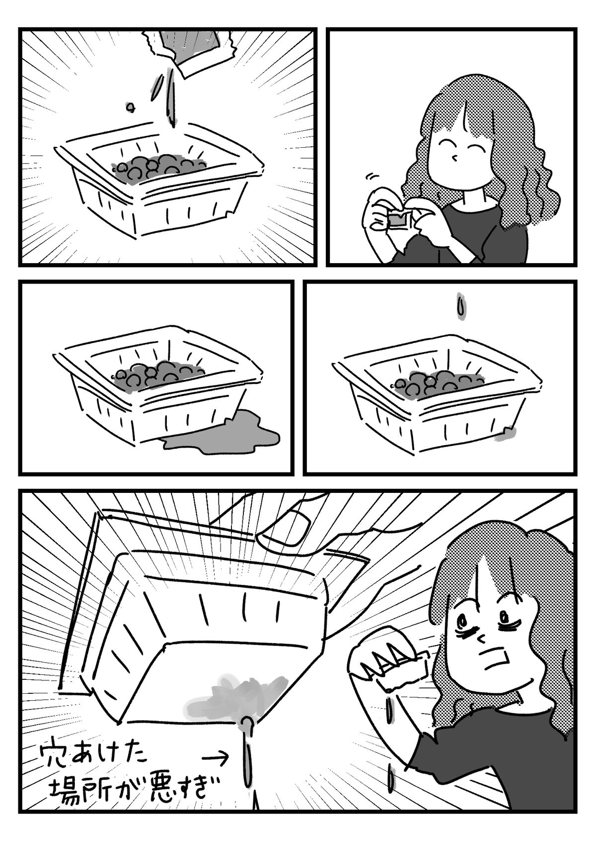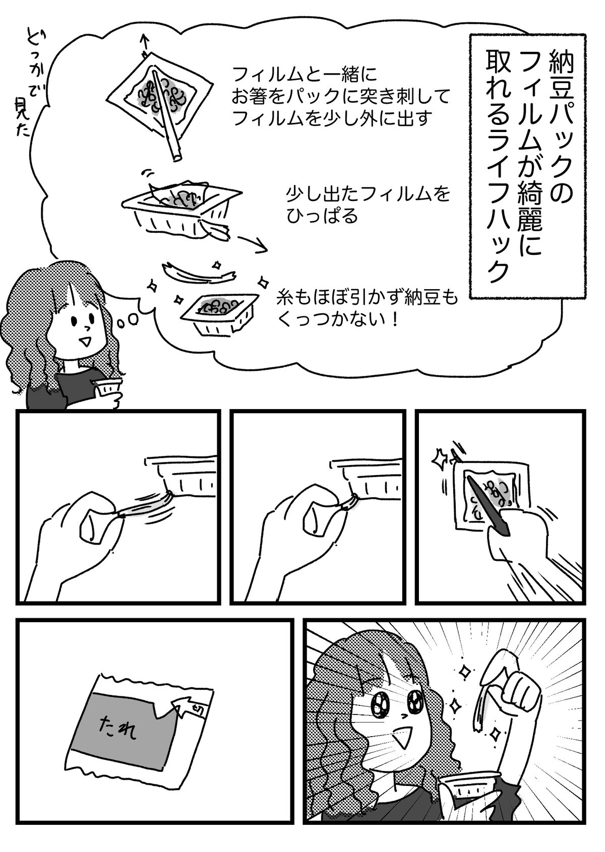 ちょっとしたライフハックすら一回は失敗する話 2023年05月27日 ライフをハック(強制掃除)底面貫通せず高い位置でやればめっちゃ便利ですよ、知ってますね、はい多分 人より大掃除する回数が多い前回記事の一件コメント返信SORE〜〜〜〜〜〜!!!控えめこだわりおしゃれって素敵です♡靴下からチラッと見えるか見えないかくらいの位置のワンポイント刺繍とか【追記】夕方別でPR漫画をアップしたのですが、こちらの都合で一旦非公開にさせていただいております。特に内容変わってないものが数日後再アップされる予定ですブログ更新通知で「?」となってしまった方すみません!↓読者登録すると、LINE通知で更新情報が届きます↓応援クリック嬉しいです!おもしろ日記ランキングにほんブログ村 「食べ物」カテゴリの最新記事 < 前の記事次の記事 > コメント コメント一覧 (7) 1. コオリマクラ 2023年05月27日 21:55 これやりましたー!! 糸を気にしないでするっといけますよね。 LINEの通知にはあるんですが、PR漫画消えてしまいました…? 0 恵水 がしました 2. 恵水 2023年05月27日 21:58 >>1 あっこちらで追記を忘れてしまってましたすみません! PR漫画はちょっとこちらの都合で一旦非公開になりました、数日後同じもの再アップされる予定です…! 0 恵水 がしました 3. こうちゃ 2023年05月27日 22:26 有名な方法なので既にご存じかもしれませんが味噌汁やお吸い物などのスープに一度お箸を入れてから納豆の糸につければ熱と塩分の作用でネバネバの糸が切れますよ!(スープ類無しで納豆を食べることが多い場合は役に立たないアドバイスですみません) 0 恵水 がしました 4. ひきわり 2023年05月27日 23:38 私は納豆のフィルムの端をつまんだまま、蓋を閉めてフィルムを引っ張り出しちゃいます! 0 恵水 がしました 6. こつぶ 2023年05月28日 14:50 >>4 同じく! 0 恵水 がしました 5. エナジー 2023年05月27日 23:59 電車の中でグフッてふいてしまったじゃないですか!タレ〜(笑) 0 恵水 がしました 7. 甘食 2023年05月29日 22:40 納豆のフィルム、お箸を真ん中に刺してグルグル回して巻き取るのもオススメです! 0 恵水 がしました コメントフォーム 名前 コメント 記事の評価 リセット リセット 顔 星 情報を記憶 コメントを投稿する