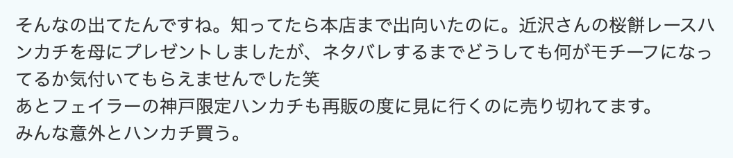 昨日のハンカチの話ですが、神戸限定ハンカチが買えなかった代わりにパンがモチーフになってるフェイラーを買って帰りました。可愛いですよ。