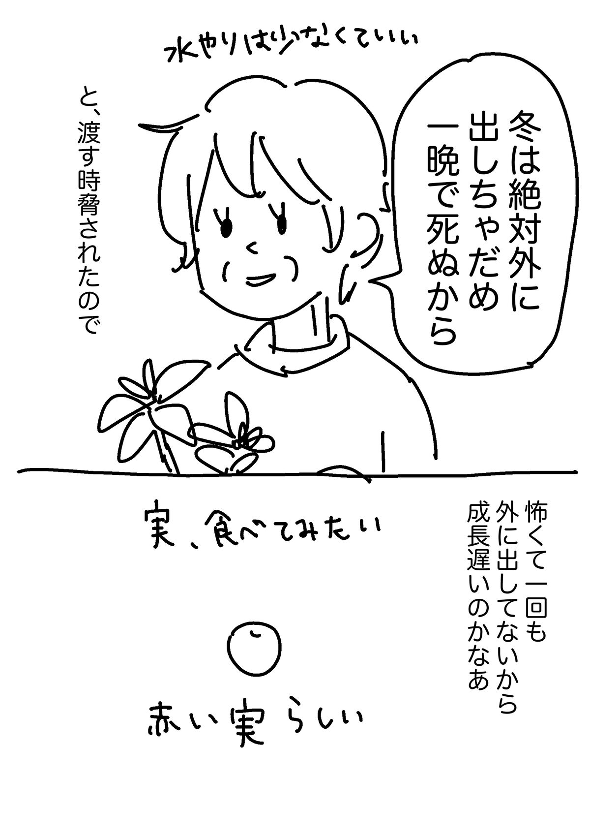 言われなきゃ幸せだった 2024年07月08日 過去の自分と比べると成長してるのに、他と比べると全然成長していない来年は咲くといいな…勝手に咲くのかな…「赤い実」ってだけで「はじけた」に繋がる世代前回記事の1件コメント返信 多分残念なお知らせですが、後ろで縛ってるやつを解いてもワ〜オ!な状態にはほぼなりません紐パンも紐を解いて脱ぐ事はないので固結びした上でリボン結びしてたりしますつまりリボンを解いても脱げないのだ…↓読者登録すると、通知で更新情報が届きます!(ライブドアアプリをインストールする必要があります)InstagramXthreads(スレッズ)Bluesky(ブルースカイ)↑最近Xが危ういので記事更新SNS色々↑↓応援クリック嬉しいです!おもしろ日記ランキングにほんブログ村 「植物」カテゴリの最新記事 < 前の記事次の記事 > コメント コメント一覧 (8) 1. こま 2024年07月08日 18:57 そろそろ植え替えの時期かも知れないですね。鉢を一回り大きくしてみては? 0 恵水 がしました 2. りんこ 2024年07月08日 19:36 コーヒーの木は3〜5年で花をつけるので、もう少しかかるかもしれないです! ちなみに花は2.3日で枯れてしまうので、蕾をつけたら毎日観察するといいですよ😊 0 恵水 がしました 3. romrom 2024年07月08日 20:18 もうタイトルと1コマ目で既に何らかの不穏なモノを察知して吹いてしまいましたw 園芸におけるお母様の振る舞いってマリーアントワネットみ感じる笑 0 恵水 がしました 4. わかめ 2024年07月08日 21:46 だめだ恵水さん(と植物)がかわいそうでかわいい。 無関心だと枯れないのがまた笑涙を誘う… 0 恵水 がしました 5. みる 2024年07月09日 06:41 うちは4年コーヒーの木育てていますが1度も花咲いたことありません!でもとっても元気に育ってます。 0 恵水 がしました 6. たも 2024年07月10日 22:31 うちにもあります〜コーヒーの木!そして一度も花を見たことがないのもナカマ… uccのコーヒーマガジンってページにコーヒーの木の育て方が載ってて楽しかったですよ。 この時期に外に出してると、確かにめっちゃ成長はしてるんですが、それより水が切れてしょっちゅうしおしおになって焦ります。葉が大きい分蒸散が激しいんですね。 0 恵水 がしました 7. 良回 2024年07月11日 07:37 恵水さん×植物回にハズレ無し!! それにしてもお母様、コーヒーの花が咲いたことない人がコメント欄にも複数居る中、花咲くの普通よね?な感じなのが、生まれながらの才能ってすげぇ…ってなります。 0 恵水 がしました 8. hfhr 2024年07月15日 21:28 紐パン、ほどいても脱げないんですか… ( ꒪⌓꒪) 創作に携わる者が子どもの夢を壊すってどうなんでしょうか(言いがかり) 0 恵水 がしました コメントフォーム 名前 コメント 記事の評価 リセット リセット 顔 星 情報を記憶 コメントを投稿する