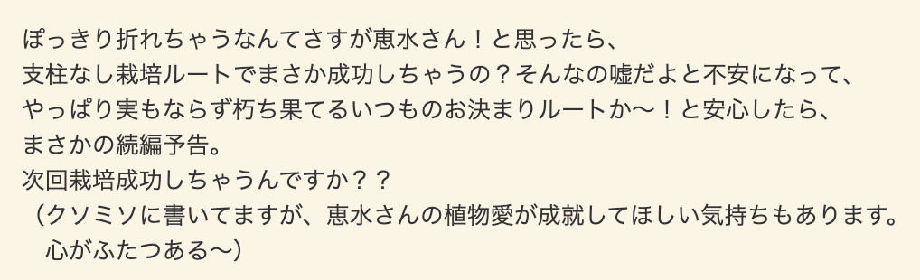 トマト育てた話 2024① 2024年07月21日 前回ダイソー愛してる続きます こういうやつ前回記事の1件コメント返信 次で育てます!私も失敗した方がネタにはなるよなあとは思いつつ毎回一生懸命育てています、わざと失敗したことはない…!!!!↓読者登録すると、通知で更新情報が届きます!(ライブドアアプリをインストールする必要があります)InstagramXthreads(スレッズ)Bluesky(ブルースカイ)↑最近Xが危ういので記事更新SNS色々↑↓応援クリック嬉しいです!おもしろ日記ランキングにほんブログ村 「植物」カテゴリの最新記事 < 前の記事次の記事 > コメント コメント一覧 (2) 1. ほるもん 2024年07月22日 14:28 槍の二刀流はおそらく…弱い…… 0 恵水 がしました 2. ぬ 2024年07月22日 19:59 構えいい角度ですね 自分は朝顔に棒付ける時カイン立ち 0 恵水 がしました コメントフォーム 名前 コメント 記事の評価 リセット リセット 顔 星 情報を記憶 コメントを投稿する