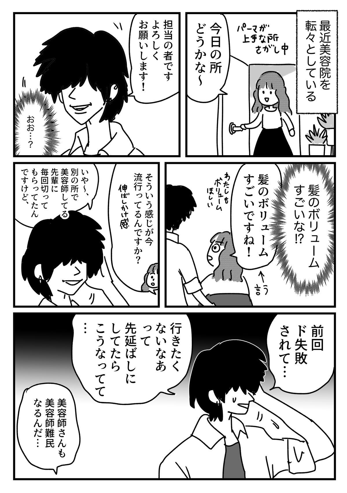 人間関係も加わって簡単じゃないのかもしれない 2024年11月15日 そういうおしゃれなのか〜って思わせて流せたのに正直な人でしたおもろいお兄さんだったのでまた行くかもしれない(加藤鷹は引っ越してから遠くて) 前回記事の1件コメント返信読みたい気持ちがあるのに合わないというか、向いてない本ありますよね…ドグラマグラ先輩ぜひ買い直して頑張って読破してください!↓読者登録すると、通知で更新情報が届きます!(ライブドアアプリをインストールする必要があります)InstagramXthreads(スレッズ)Bluesky(ブルースカイ)↑最近Xが危ういので記事更新SNS色々↑↓応援クリック嬉しいです!おもしろ日記ランキングにほんブログ村 「美容」カテゴリの最新記事 < 前の記事次の記事 > コメント コメント一覧 (4) 1. めんま 2024年11月15日 15:00 元美容師ですけど、めっちゃ分かります 私が働いていたところはスタッフが複数人いる店舗だったので、スタッフ同士で切る事が多かったんですけど、私は先輩の切り方が好きじゃなかったので、伸ばしまくって限界がきたら「勉強をかねて他の店に行ってきます」って言って別の店で切っていました(カラーは後輩にして貰ってました) 勉強になるのは本当なので、美容師界隈で有名な店で切ってもらう為に旅行もかねてよその県に行くとかもしていました 辞めた今は何の気兼ねもなく好きなところに行けるので幸せです 0 恵水 がしました 2. 男好き 2024年11月15日 19:17 恵水さんの描く男すきです 0 恵水 がしました 3. 名無し 2024年11月16日 08:22 美容師の世界も大変なんだな… 0 恵水 がしました 4. HW 2024年11月18日 16:00 加藤鷹(仮)さんのお話すごく好きだったので、また機会があれば切ってきて欲しいw 0 恵水 がしました コメントフォーム 名前 コメント 記事の評価 リセット リセット 顔 星 情報を記憶 コメントを投稿する