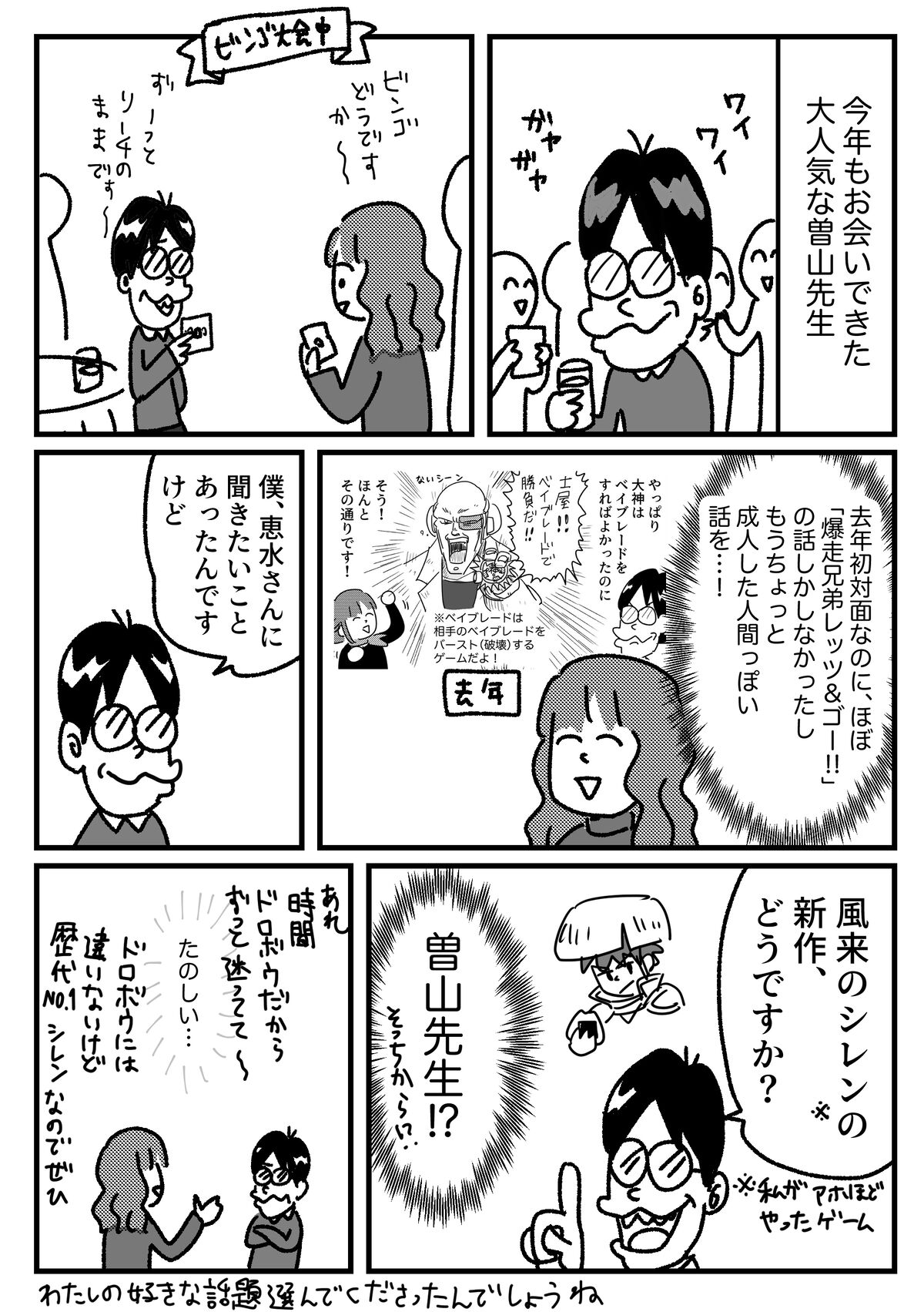 ライブドアクリエイター大忘年会2024の話③ 2025年01月10日 その①その② 漫画も面白い 去年お会いした時の話サイン本もいただいてしまった…!うれしい 次回は大人の会話できますように 無理かなお喋りしていたらカイエさんがお声掛けくださって一緒に写真人と写真の声掛け頻度を上げる、毎年目標なんですが自分から全然しなくてだめですねありがたい!前回記事の1件コメント返信 3、2よりゆるく続けられる工夫沢山!ってかんじなので、2コンプしてからでもよいと思いますよ!がんばってください↓読者登録すると、通知で更新情報が届きます!(ライブドアアプリをインストールする必要があります)InstagramXthreads(スレッズ)Bluesky(ブルースカイ)↑最近Xが危ういので記事更新SNS色々↑↓応援クリック嬉しいです!おもしろ日記ランキングにほんブログ村 「ブログのこと」カテゴリの最新記事 < 前の記事次の記事 > コメント コメント一覧 (1) 1. お鞄、可愛い予感 2025年01月13日 15:38 いつも楽しく読ませていただいてます。 マンガと関係ない話で申し訳ないのですが、最後のお写真の恵水さんのお鞄が、絶対かわいい!!のでどこかにお写真など掲載されてますか?? されてましたら、どんな柄かちょっと見たいです…。 色味とか可愛く感じました。 0 恵水 がしました コメントフォーム 名前 コメント 記事の評価 リセット リセット 顔 星 情報を記憶 コメントを投稿する