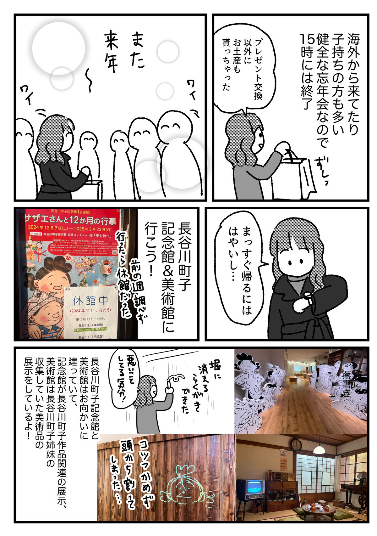 ライブドアクリエイター大忘年会2024の話⑤【終】 2025年01月20日 その①その②その③その④寂しさや嫉妬はない私は私で最高のアフターを過ごしていたのでただこうやって皆さん想像以上の親睦をちゃんと深めているのだなとへへへ 私は原作派なのですが、長谷川町子先生の絵や色使いはたいへんおしゃれでかわいいので大好き時間足りなかったけど喫茶も行きたかった前回記事の1件コメント返信呼び方しっかり決まっている訳ではないんですね?ライバル…!↓読者登録すると、通知で更新情報が届きます!(ライブドアアプリをインストールする必要があります)InstagramXthreads(スレッズ)Bluesky(ブルースカイ)↑最近Xが危ういので記事更新SNS色々↑↓応援クリック嬉しいです!おもしろ日記ランキングにほんブログ村 「ブログのこと」カテゴリの最新記事 < 前の記事次の記事 > コメント コメント一覧 (2) 1. はる 2025年01月20日 19:37 恵水さんの漫画、行動、好きだなぁーって思います! 0 恵水 がしました 2. くま 2025年01月22日 05:33 まきびし、も〜さんに当たっておられましたね。絵日記界隈です観測できて勝手に嬉しい気持ちになっています(笑) 0 恵水 がしました コメントフォーム 名前 コメント 記事の評価 リセット リセット 顔 星 情報を記憶 コメントを投稿する